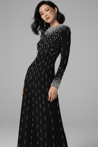 Dramatic yet timeless, the Amarise Gown by LuxeLane is a luxurious reinterpretation of the classic black evening dress. Handmade with meticulous attention to detail, this floor-length A-line silhouette is adorned with intricate hand-applied beadwork and sequins, shimmering gracefully with every movement to create a luminous, couture-inspired finish.