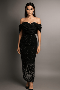 Radiate red-carpet elegance in the Aurora Off-Shoulder Pearl & Rhinestone Maxi Gown — a masterpiece of luxury craftsmanship. Designed with a figure-sculpting bandage silhouette, this gown features a graceful off-shoulder neckline adorned with hand-applied pearls, sparkling rhinestones, and shimmering diamond accents.