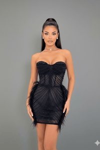 The elegant heart-shaped neckline highlights the décolletage, while the strapless design creates a clean, modern silhouette. Carefully placed ruched detailing enhances curves, and the beaded trim with sequin and feather accents adds dramatic texture and stage-ready sparkle. Finished in a sleek mini length, this dress is designed for women who want to stand out at evening parties, performances, and high-energy celebrations.