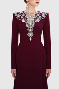 Beaded Neckline Long Sleeve Bodycon Maxi Evening Gown
