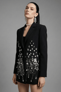 The classic notched collar and single-breasted closure bring timeless tailoring, while intricate beading, pearl accents, and rhinestone detailing elevate the design with luxurious sparkle. The elongated blazer cut enhances the figure, creating a confident, sculpted shape that transitions effortlessly from formal events to upscale evening occasions. Sophisticated, bold, and impeccably crafted, this piece embodies Luxe Lane’s signature balance of structure and femininity.