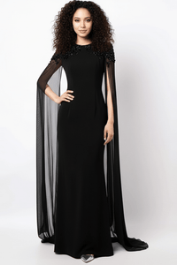 Dramatic elegance meets timeless design in the Valencia Gown by LuxeLane. Handmade with exceptional craftsmanship, this floor-length masterpiece features a sophisticated cape sleeve overlay, delicately hand-beaded with shimmering sequins that capture the light with every movement. Designed in a sleek A-line silhouette with a refined O-neckline, the gown strikes a graceful balance between structure and fluidity.