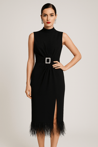 The Noir Plume Gown from Luxe Lane is a celebration of evening elegance and commanding glamour. Crafted from a sculpting rayon-polyester blend with a touch of spandex, it features a sleek bodycon silhouette adorned with soft feather trim and shimmering crystal accents.