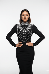 The elegant high O-neckline and full-length fitted sleeves add refined, modest structure, while the meticulously applied rhinestones and bead embellishments shimmer with every movement. Breathable, supportive, and exquisitely detailed, this gown is created for the most elevated evenings — where confidence and craftsmanship define the moment.