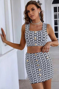 The square-neck sleeveless top pairs seamlessly with the matching midi-length skirt, both detailed with subtle button accents for a classic-meets-contemporary twist. Designed for the stylish minimalist, Cambria transitions effortlessly from casual outings to smart daytime events.