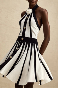 The halter neckline highlights the shoulders and neckline beautifully, while the A-line silhouette and pleated skirt design create soft movement and a flattering shape. A refined black-and-white contrast pattern adds visual impact, making this mini dress perfect for evening events where modern style and sophistication matter. Finished with subtle button detailing and a built-in bra for support, this piece blends structure, comfort, and standout appeal.