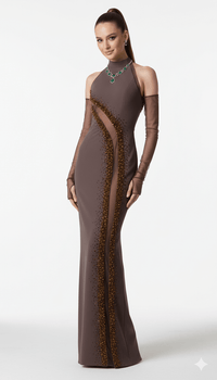 The halter-style high neckline creates a sleek, elongated silhouette, beautifully balanced by long sleeves for a polished and sophisticated finish. Intricate hand-applied crystal, diamond, and rhinestone beading adds luminous detail, drawing attention without overpowering the clean, minimalist design. Finished in a floor-length bodycon cut with an empire waistline, this gown enhances natural curves while maintaining timeless elegance.