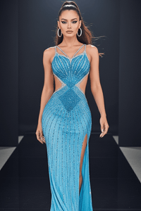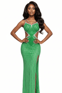 The sculpting V-neckline and strategic cut-outs contour the body with precision, while the body-hugging silhouette flares into a dramatic mermaid hem and sweeping train for a cinematic finish. Made from a high-stretch worsted spandex blend, this gown delivers sculpted comfort and radiant shine—perfect for stage performances, proms, pageants, and formal evenings where elegance meets the spotlight.