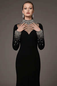 The high stand neckline and long fitted sleeves exude sophistication, while the flowing A-line silhouette drapes effortlessly, creating a statuesque, red-carpet-worthy presence. Designed for grand galas, formal banquets, and high-profile celebrations, this gown is the epitome of elegance that transcends seasons.