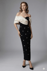 The refined off-the-shoulder neckline highlights the collarbones and shoulders, while hand-applied rhinestone beading adds radiant sparkle with every movement. An empire waistline elongates the frame for a statuesque finish, balancing sensuality with timeless elegance. Breathable, anti-wrinkle, and designed for year-round wear, Isadora is the ultimate choice for luxury night events and formal celebrations.