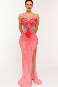 Designed to dazzle, the Rosalie Blush Crystal Gown by LuxeLane is a breathtaking fusion of red-carpet glamour and feminine power. Handmade with meticulous precision, this shimmering candy-pink masterpiece features all-over hand-applied rhinestones, crystals, and diamond-like embellishments that hug every curve and reflect light like a dream.