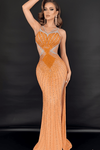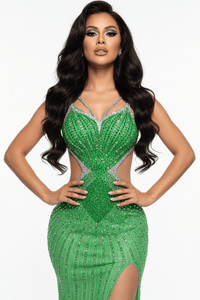A sultry V-neckline and strategic cut-outs enhance the silhouette, while the body-hugging shape flares into a dramatic mermaid hem with a subtle sweep train. Built for impact and crafted entirely by hand, Rosalie is the ultimate showstopper — perfect for proms, pageants, stage performances, and formal evening events where elegance meets spotlight energy.