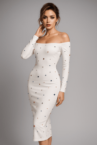 Crafted from our signature sculpting knit blend, this tea-length dress features a flattering off-the-shoulder neckline, long sleeves, and crystal embellishments that catch the light with every step. The fitted silhouette hugs in all the right places, while the tasteful thigh-high slit adds just the right edge.