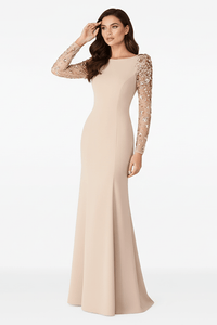 The elegant O-neckline, long fitted sleeves, and empire waistline sculpt a graceful, elongated silhouette that flows into a fluid mermaid hem. Breathable yet luxurious, Elysia blends couture craftsmanship with refined glamour — making it the perfect gown for banquets, red-carpet evenings, and high-profile celebrations where sophistication is essential.