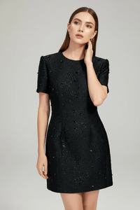 Expertly crafted by hand from a high-quality linen-spandex blend, this above-knee dress features shimmering hand-beaded details, intricate rhinestone embroidery, and a refined crew neckline that adds a regal touch. The full-length sleeves lend sophistication while perfectly balancing the flirty hemline, making Fiorella an exquisite choice for cocktail events or high-end soirées.
