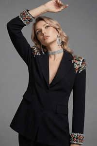The notched collar and single-breasted closure create a timeless tailored profile, while the elongated length adds elegance and authority. Intricate gemstone bead embellishments at the shoulders introduce a couture-inspired edge, transforming classic outerwear into a bold fashion statement. Designed for formal evenings, upscale events, and sophisticated styling, this blazer blends modern elegance with confident femininity.
