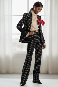 The blazer features a statement red bow accent at the neckline, structured shoulders, and full-length sleeves. Paired with cuffed, high-waisted trousers, the set delivers a playful yet polished silhouette. The classic black and white polka dot pattern adds a timeless charm with a fashion-forward twist.