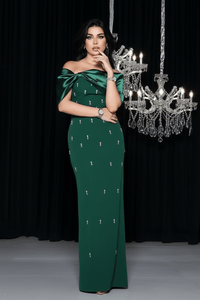 The striking off-the-shoulder neckline is finished with a sculptural black satin bow, adding a signature touch of Luxe Lane drama. Perfect for gala events, formal evenings, or that unforgettable moment where elegance meets allure.