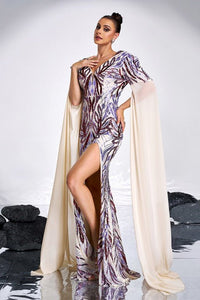 The floor-length silhouette flatters the figure with its body-skimming cut and dramatic V-neckline, while the attached sequin cape sleeves flow gracefully for a goddess-like effect. Designed for galas, proms, and formal evening celebrations, this gown combines couture-level artistry with effortless sophistication.