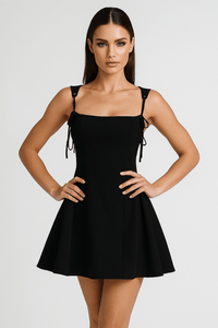 Crafted from lightweight 100% polyester worsted fabric, this black halterneck mini dress features a sleek A-line silhouette with spaghetti straps and an open back design. With a natural waistline and flattering fit, Lyla’s breathable fabric and chest padding make it easy to wear all day — no extra layers needed.