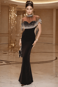 The showstopping detail? A sheer cape hand-adorned with sparkling rhinestones, cascading over your shoulders like stardust. Whether for a black-tie gala, formal wedding, or red-carpet moment — this handcrafted gown is your declaration of power, poise, and timeless allure.
