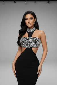 The refined halter neckline frames the shoulders beautifully, while crystal and rhinestone embellishments accent the gown with subtle sparkle. Strategically placed cutout detailing enhances the silhouette without overpowering its timeless appeal. Finished in classic black with a clean sheath profile, Noire is a versatile statement piece for formal evenings, weddings, cocktail parties, and upscale events where sophistication is essential.