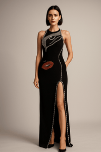 Step into pure artistry with the Noire Visage Pearl-Trim Maxi Gown — a statement black bandage evening dress that blends elegance with avant-garde design. Featuring a rhinestone-encrusted abstract face motif at the bodice and pearl-trimmed edging, this gown is more than fashion — it’s wearable art.