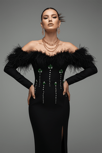 • One-shoulder neckline with dramatic feather detailing
