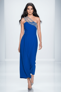 One-shoulder asymmetrical neckline with rhinestone strap
