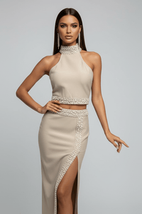 The halter-style top features hand-applied pearl embellishments, adding refined shine and timeless elegance. Paired with a high-waisted bandage skirt finished with a dramatic high side slit, the silhouette strikes the perfect balance between sophistication and bold sensuality. Whether you're stepping into a rooftop party, a luxury dinner, or a night out, Pearl Empress guarantees a spotlight moment.