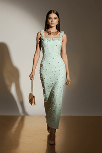 Delicate elegance meets sculpted sophistication in this pearl floral beaded sleeveless bodycon maxi evening dress, designed for women who appreciate refined luxury and graceful detail. Crafted from premium spandex–polyester bandage fabric, the dress contours the body with a smooth, supportive fit while remaining breathable and comfortable for extended wear.