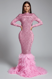 Command every spotlight in this pink feather crystal long sleeve evening gown, a handcrafted couture-inspired masterpiece designed for unforgettable entrances. Meticulously adorned with hand-applied crystals, rhinestones, and feather detailing, this luxury gown delivers radiant sparkle with refined elegance.