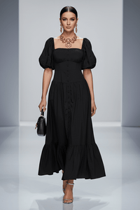 Crafted with a structured square neckline and voluminous puff sleeves, it flows into a soft A-line silhouette that flatters every movement.