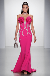 The strapless neckline is adorned with hand-applied rhinestone chains that trace the shoulders in a glimmer of light, while individually crafted 3D floral embellishments bloom across the fitted bodice, showcasing exceptional artistry. Flowing into a graceful mermaid skirt, the silhouette contours the body with fluid elegance, ensuring an unforgettable entrance at every occasion.