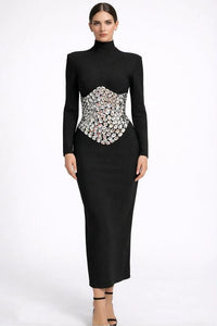 The high neckline and long sleeves create a polished, sophisticated silhouette, while subtle rhinestone embellishment at the waist draws the eye inward, enhancing shape and definition. Its bodycon fit and maxi length elongate the frame, making it a confident choice for formal events where elegance and presence matter most.