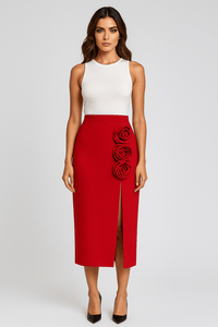 Crafted from a stretchy spandex/polyester blend, this bodycon pencil skirt features bold 3D floral embroidery and a daring side slit that adds movement and drama. The natural waistline flatters your shape, while the knitted blazer-textured fabric keeps the look crisp and structured.