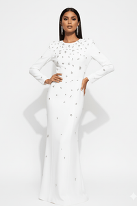 Glamour, grace, and undeniable presence — the Rosabelle High-Neck Rhinestone Gown is crafted for women who love making an entrance. Handmade with couture-level precision, this exquisite floor-length gown features a dramatic high neckline, fully embellished hand-beaded rhinestone bodice, and a sculpted mermaid silhouette that accentuates every curve with timeless sophistication.