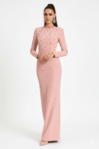 Glamour, grace, and all eyes on you — the Rosabelle High-Neck Rhinestone Gown embodies elegance in its most captivating form. This floor-length pink evening gown features a dramatic high neckline, full-length sleeves, and a fully embellished rhinestone and beaded bodice that sparkles from every angle.