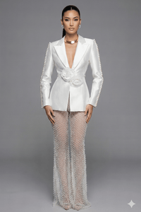 The sheer beaded flare pants add graceful movement and radiant shine, creating a harmonious balance between structure and softness. Breathable, refined, and statement-ready, this two-piece set is the perfect choice for upscale evenings, luxury events, and high-profile fashion moments.