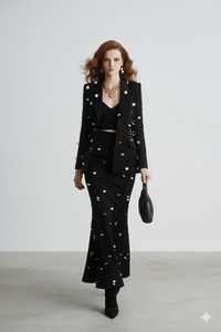 Elevate your wardrobe with this black and white sequin two-piece set, a masterpiece of sophistication and sparkle. The tailored V-neck blazer features intricate sequin embroidery that glimmers with every movement, paired with a flowing pleated maxi skirt that exudes elegance and grace. Designed for confident women who appreciate modern glamour with a timeless twist, this set offers a perfect balance of structure, shimmer, and comfort.