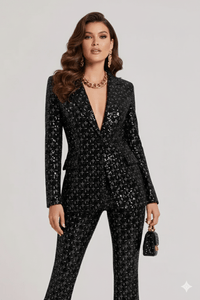 The Sequin Velvet Blazer and Pant Set delivers modern sophistication with a touch of glamour.