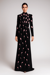 Crafted from a soft polyester-cotton blend, the gown embraces the body in a sculpted mermaid silhouette with an empire waist that elongates the figure. Finished with delicate hand-applied floral detailing and graceful contour lines, Seraphina is a handmade statement of modern elegance, perfect for upscale events, formal soirées, and red-carpet-worthy moments.
