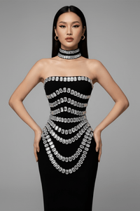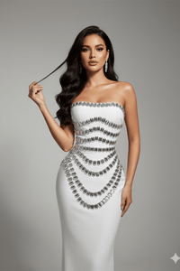 Bold, seductive, and made to mesmerize — the Seraphina Sparkly Maxi Dress by LuxeLane is the ultimate statement piece for glamorous evenings. Crafted from LuxeLane’s signature sculpting bandage fabric, this strapless bodycon gown defines the silhouette with smooth precision, while shimmering sparkly embellishments add couture-level brilliance.