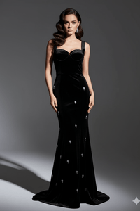 Adorned with all-over rhinestone embellishments, the gown shimmers with every step, ensuring you own the spotlight. A built-in bra offers support without compromising comfort, while the luxurious velvet finish adds depth, texture, and sophistication. Breathable, eco-friendly, and designed for unforgettable evenings, the Seraphina Gown is your signature for timeless glamour.