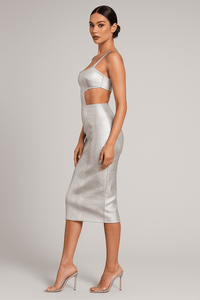 Step into bold sophistication with this silver-stamped hollow-out bandage midi dress, crafted to sculpt, define, and make an unforgettable entrance. Designed from premium spandex–polyester bandage fabric, it contours every curve while offering breathable comfort and sleek durability.
