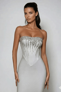 Step into sophistication with this strapless rhinestone corset gown, designed to capture the essence of refined luxury. Crafted from a high-quality spandex-polyester blend, this floor-length silhouette features a beaded corset bodice that sculpts the figure and reflects light with every movement. The off-shoulder neckline and sleek bodycon design create an alluring yet timeless profile — perfect for evening galas, engagements, and special celebrations.