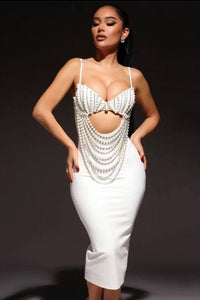 Sleek, sculpted, and show-stopping — the Vienna Dress by LuxeLane is made for nights that matter. Handmade with meticulous precision, this elegant bodycon gown features a deep V-neckline, cut-out waist design, and luxurious hand-applied pearl chain details that shimmer beautifully under the lights.